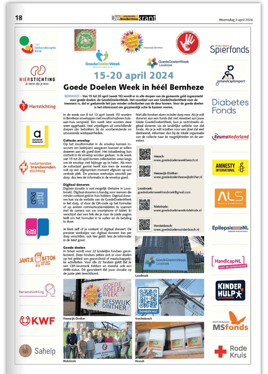 De GoedeDoelenWeek organisatie van Heeswijk-Dinther, Heesch, Nistelrode, Vorstenbosch en Loosbroek heeft de Goede Doelen Week gelijk gepland voor de gehele gemeente. Zie eventueel de digitale MooiBernhezer krant: https://www.mooibernheze.nl/reader/22833#p=18
